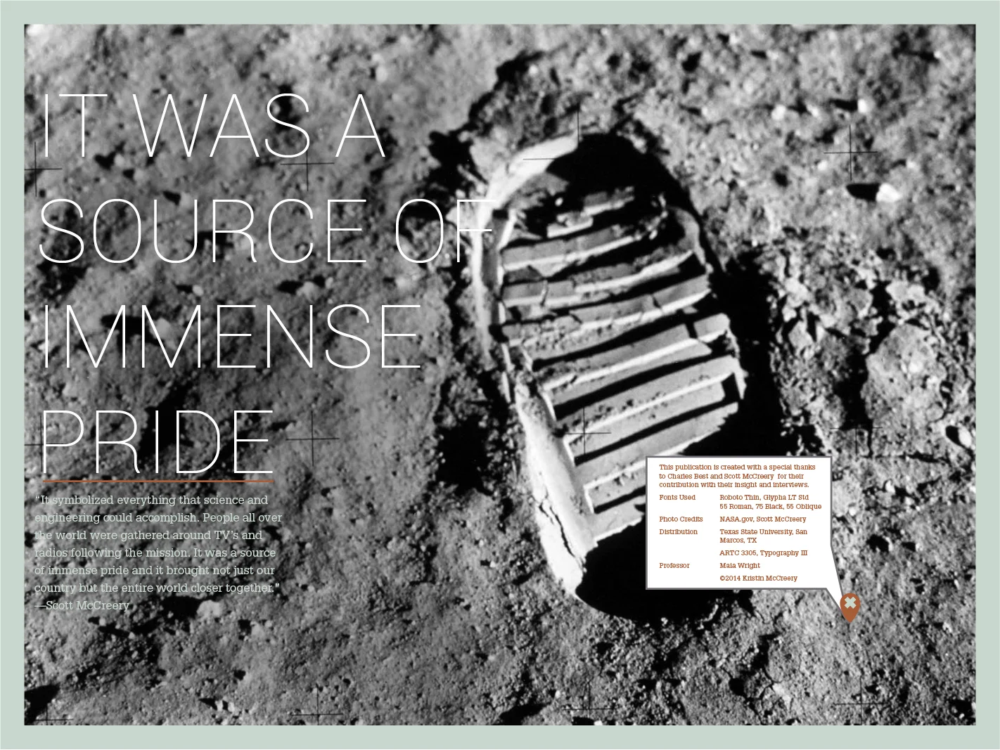 The Space Race had a great effect on many Americans, It was a source of great pride for our country. The following is an interactive PDf based around two personal experiences with The Space Race, Apollo 11 and Neal Armstrong's first steps on the moon. To experience the full PDF please download it.